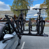 Das Anheben von Fahrrädern, insbesondere von schwereren E-Bikes, auf das Autodach ist mit Risiken verbunden. Es ist leicht, versehentlich einen Pedalstreifen in den Lack zu bekommen. Auf den Dropracks Standard passen vier Fahrradträger nebeneinander, wenn Sie sie abwechselnd vorwärts und rückwärts, längs – nach hinten – montieren.