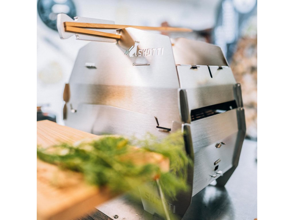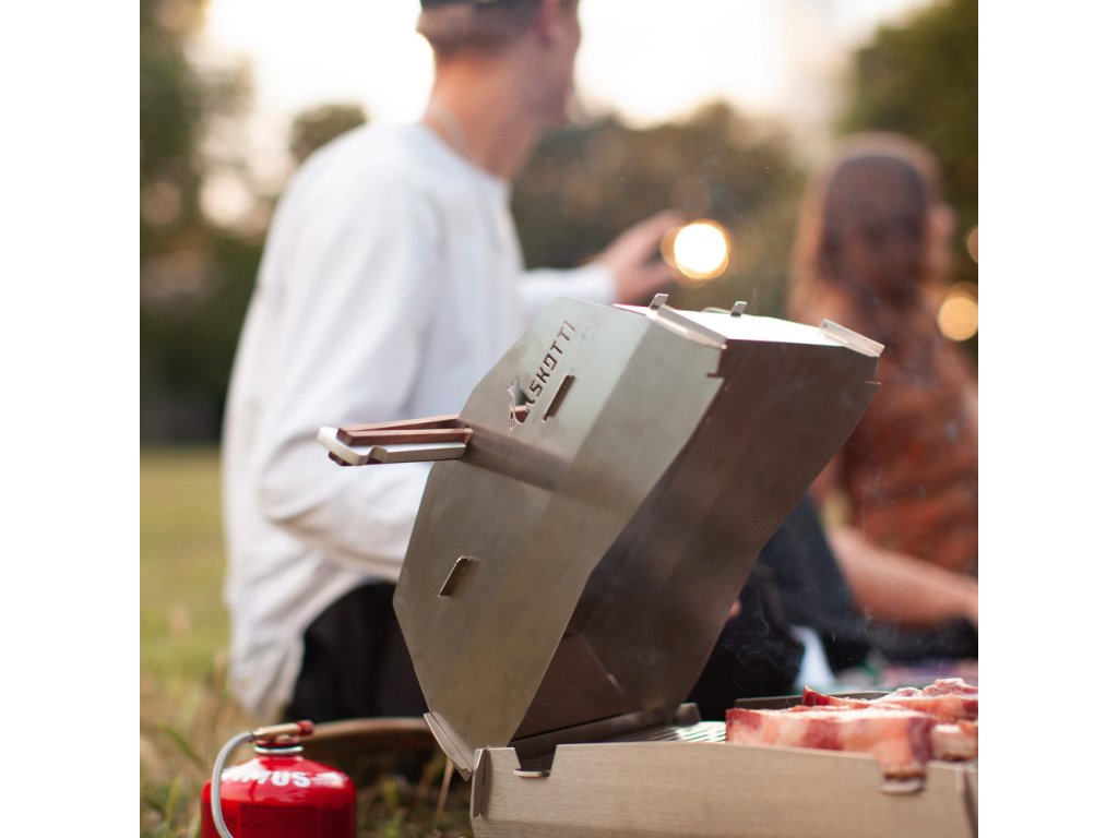 Wenn Sie zwei oder drei der fünf Edelstahlteile des SKOTTI CAP miteinander verbinden, erhalten Sie einen einfachen Windschutz. Mit drei oder allen vier Seitenteilen können Sie auch einen Drehspieß befestigen. Die multifunktionale SKOTTI Abdeckhaube, oben geschlossen und an einer Seite offen, verwandelt Ihren SKOTTI Grill in einen Pizzaofen. Alle fünf Teile zusammen bilden eine komplette Abdeckhaube. Auf diese Weise können Sie eine Reihe von Rezepten über das klassische Grillen von Steaks und Würstchen hinaus zubereiten, wie z. B. Brot, Pizza, Fisch, Fleisch- und Gemüsespieße, Maiskolben oder größere Stücke, die länger gekocht werden müssen.