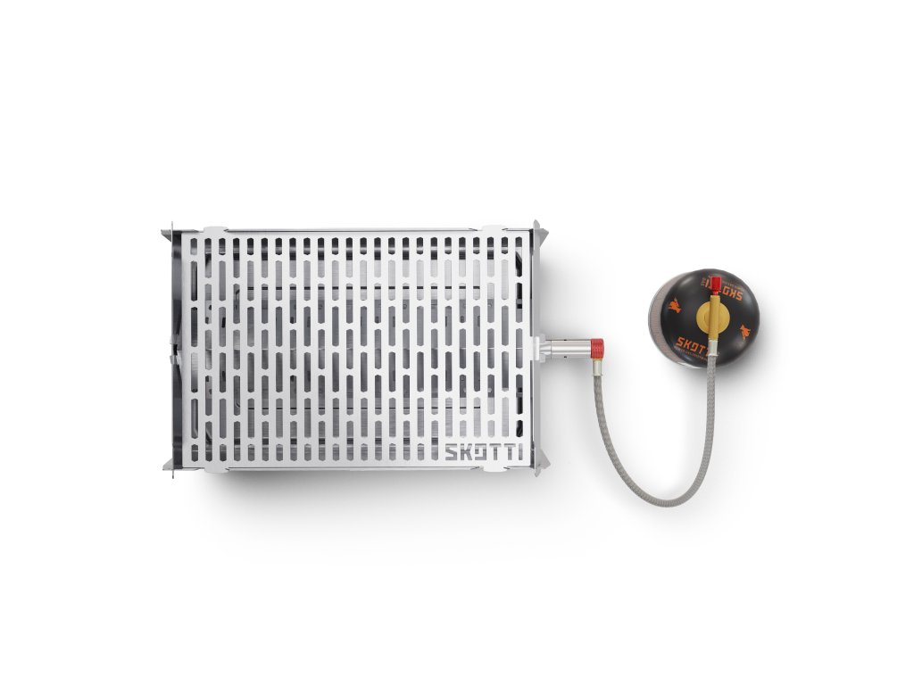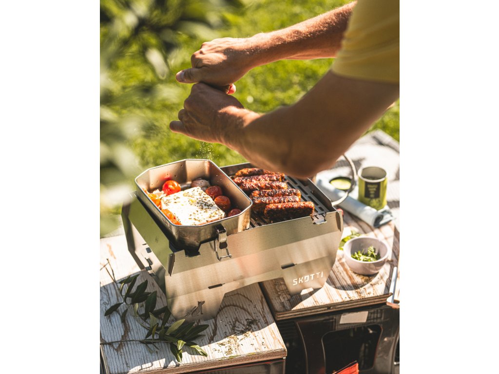 Der Marken-SKOTTI bleibt die Top-Wahl zum Grillen, Kochen, Braten und Backen im Park, am See, auf dem Balkon – auf dem Tisch oder auf der Picknickdecke. Wir haben sogar auf einem Snowboard, einem Paddleboard auf offener See oder auf der Motorhaube eines Autos gegrillt – mit dem SKOTTI können Sie nicht nur überall grillen, sondern auch mit Gas, Kohle oder Holz kochen, braten, backen oder erhitzen. Er ist der weltweit erste Gasgrill, der aus steckbaren Komponenten besteht: Sie können ihn in einer Minute ohne Werkzeug zusammenbauen. Er heizt sich mindestens genauso schnell auf wie ein normaler Standgrill. Gaskartusche aufdrehen, Feuerzeug an die Zündöffnung halten, fertig!