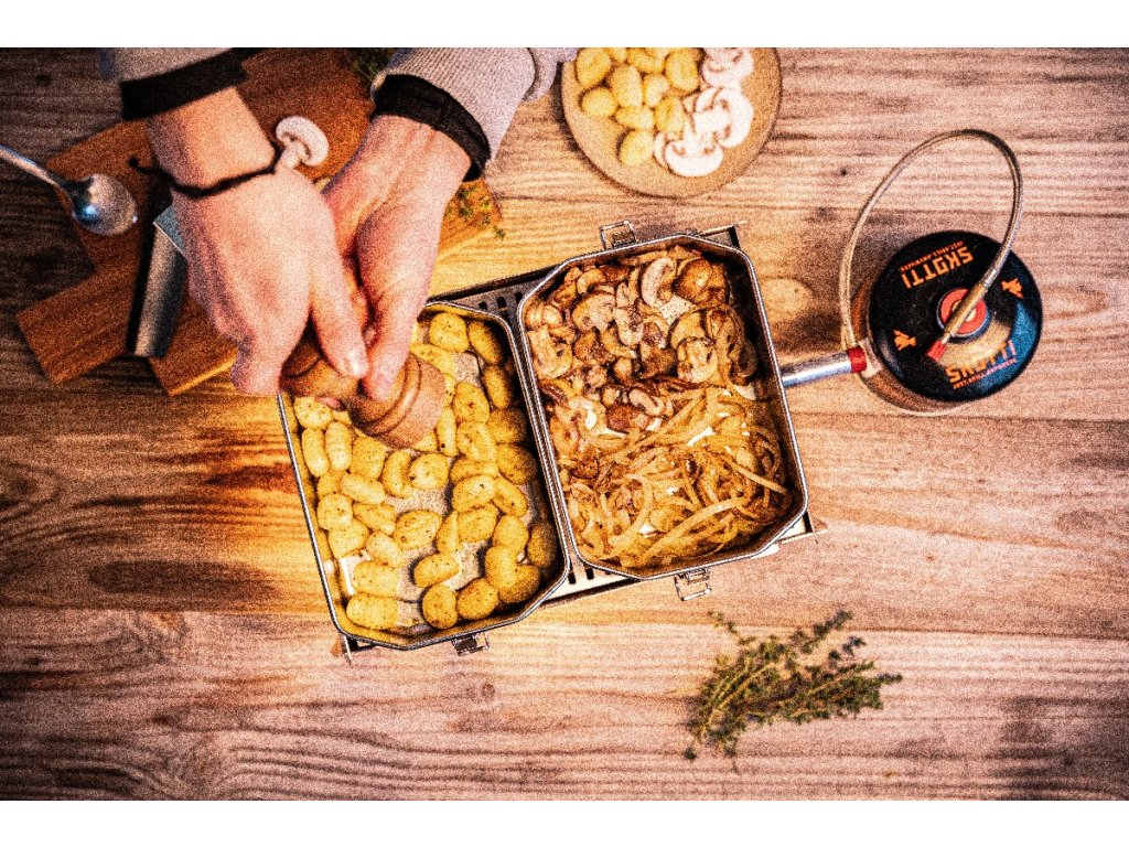 In addition, both front edges of the new SKOTTI grill are slightly raised, which allows the grill to offer even more functions while maintaining almost the same pack size. For example, a larger plancha or pan can be used because all sides are now at the same height.