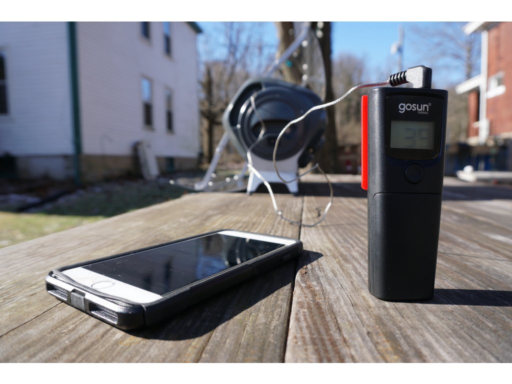 - Termometr GoSun Thermo jest wyposażony w ekran LCD, bezpłatną aplikację i przedłużony kabel sondy do szerokiego zakresu zastosowań. Natychmiastowe raportowanie temperatury na ekranie i z powrotem do telefonu. Aplikacja wyśle powiadomienie na telefon, gdy jedzenie będzie gotowe w wybranej temperaturze.